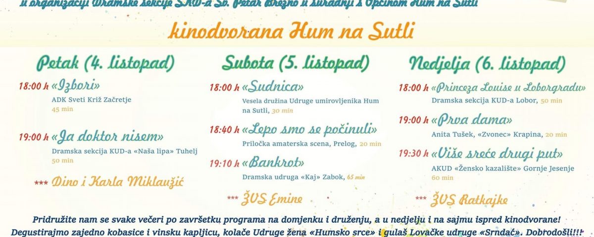 Dramska sekcija ŠKD-a Sv. Petar Brezno u suradnji s Općinom Hum na Sutli organizira 2. Humske dane glume koji će u tri dana okupiti osam glumačkih družina. U petak, 4. listopada nastupaju Amatersko dramsko kazalište Sveti Križ Začretje s predstavom „Izbori“ i Dramska sekcija KUD-a „Naša lipa“ Tuhelj s predstavom „Ja doktor nisem“. Posjetitelji će u subotu, 5. listopada, imati priliku vidjeti predstave: „Sudnica“, Vesele družine Udruge umirovljenika Hum na Sutli, „Lepo smo se počinuli“ Ivice Novaka iz Priločke amaterske scene te „Bankrot“ Dramske udruge „Kaj“ iz Zaboka. Posljednjeg dana ove manifestacije predstavu „Princeza Louise u Loborgradu” će izvesti Dramska sekcija KUD-a Lobor, Anita Tušek iz Humorističnog društva „Zvonec“ iz Krapine nastupit će s predstavom „Prva dama“, a AKUD „Žensko kazalište“ Gornje Jesenje s predstavom „Više sreće drugi put“. Humski dani glume održavaju se u kinodvorani, a sve predstave počinju u 18 sati. Po završetku predstava nastupit će Dino i Karla Miklaužić u petak, Ženska vokalna skupina „Emine“ u subotu te Ženska vokalna skupina „Ratkajke“ u nedjelju. Svake večeri po završetku programa bit će upriličen domjenak i druženje, a u nedjelju i sajam ispred kinodvorane. Ulaz na svih osam predstava je besplatan.
