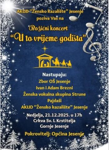 Božićni koncert pod nazivom „U to vrijeme godišta“ održat će se u nedjelju, 21. prosinca 2025. godine, s početkom u 17 sati, a organizira ga AKUD „Žensko kazalište“ Jesenje, uz pokroviteljstvo Općine Jesenje.