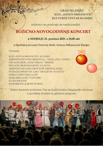 Tradicionalni božićno-novogodišnji koncert KUD-a „Antun  Mihanovićodržat će se u nedjelju 21. prosinca u 18 sati u Sportskoj dvorani Osnovne škole. Organizatori koncerta su Grad Klanjec, KUD „Antun Mihanović“ i Kulturni centar Klanjec. Posjetitelje očekuje glazbeni program prepun božićnih, ali i zabavnih, tamburaških, starogradskih pa i rock pjesama, folklornih koreografija, dvorskih i građanskih plesova koje su pripremile sve sekcije KUD-a „Antun Mihanović“, Mješoviti pjevački zbor „Naša lipa“ iz Tuhlja, Mješoviti pjevački zbor Župe Navještenja BDM Klanjec, Pjevački zbor „Đuro Prejac“ Desinić, Pjevački zbor Kraljevec na Sutli, Puhački orkestar „Lira“ iz Kraljevca na Sutli, solisti Maja Miklaužić Vahtarić, Ellen Bogović, Karla i Dino Miklaužić, Igor Siročić & Božićni band  – ističu organizatori. Grad Klanjec i gradonačelnik Zlatko Brlek priređuju nakon koncerta i tradicionalno božićno-novogodišnje druženje za građane i sve posjetitelje koncerta uz glazbeni program. Ulaz je slobodan i besplatan za sve posjetitelje.