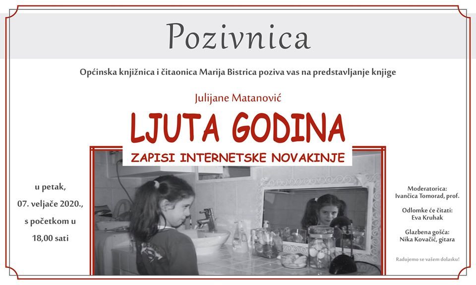 U Općinskoj knjižnici i čitaonici Marija Bistrica ovaj će se petak 7. veljače održati predstavljanje knjige Julijane Matanović „Ljuta godina (Zapisi internetske novakinje)”. Zapisi internetske novakinje […]