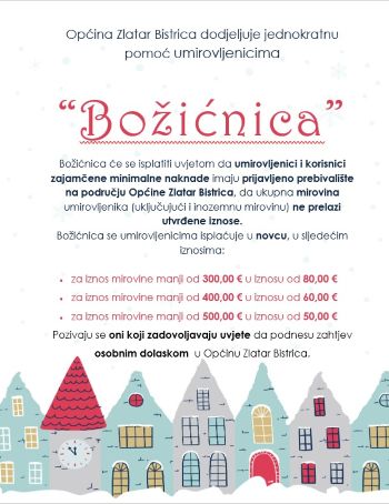 Grad Zlatar i ove godine u nadolazeće blagdansko vrijeme pomaže svojim umirovljenicima i korisnicima zajamčene minimalne naknade s iznosom od 50,00 eura. Pravo na isplatu “božićnice” […]