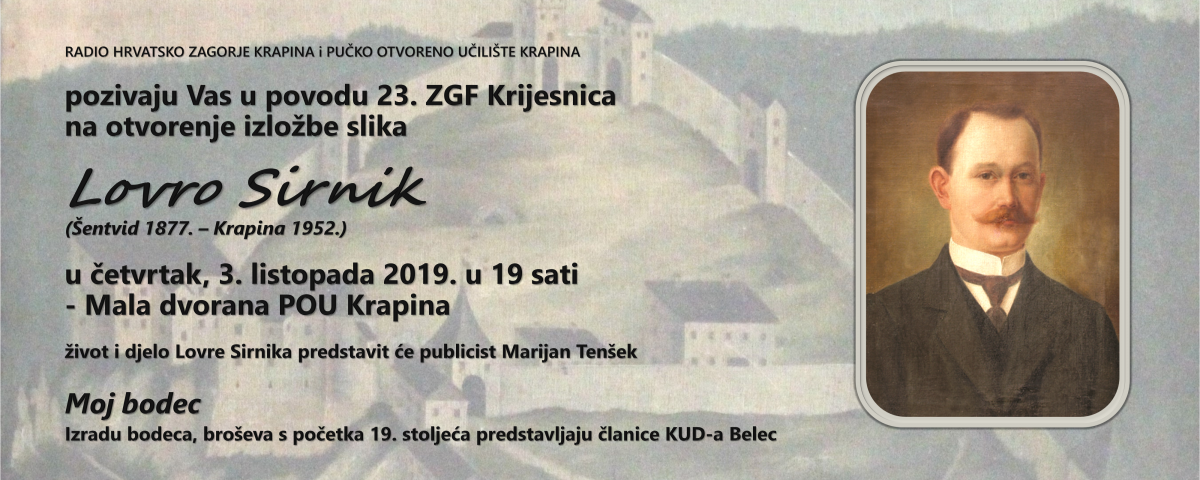 Pred nama je 23. Zagorski glazbeni festival Krijesnica. Održat će se u petak, 18. listopada, u organizaciji Radija Hrvatsko zagorje Krapina u krapinskoj festivalskoj dvorani. Ususret Krijesnici, u četvrtak 3. listopada, u 19 sati, u maloj dvorani Pučkog otvorenog učilišta Krapina je otvorenje izložbe slika Lovre Sirnika. Život i djelo Lovre Sirnika predstavit će publicist Marijan Tenšek. U programu će sudjelovati  i članice KUD-a Belec koje će predstaviti izradu bodeca,  broševa  s početka 19 stoljeća.