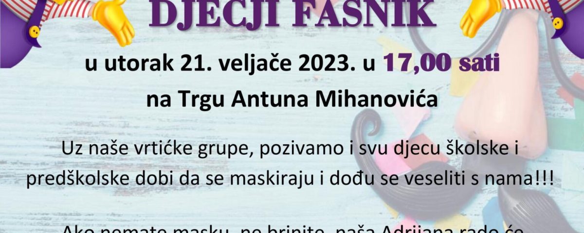 Dječji fašnik u Klanjcu održat će se na Trgu Antuna Mihanovića u organizaciji Dječjeg vrtića „Kesten”, Kulturnog centra i Gradske knjižnice. Organizatori pozivaju sve mališane, ali i njihove roditelje, bake, djedove… da im se pridruže na veselom maskiranom druženju. Početak je u 17 sati.