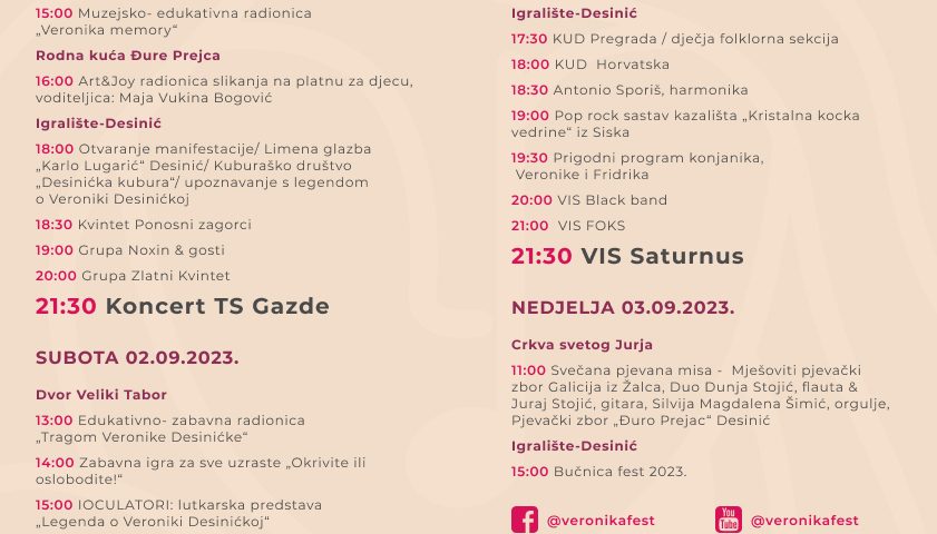 Od petka pa sve do nedjelje će u općini Desinić sve biti u znaku kulturno-turističke manifestacije Veronikafest. Tim će se povodom i u Dvoru Veliki Tabor u petak i subotu od 14 sati održati prigodan program, saznajemo od voditeljice DVT Renate Dečman. U programu će se naći zabavni igrokaz, lutkarska predstava te tri edukativno-zabavne radionice namijenjene djeci starijoj od 7 godina te odraslima. Riječ je o radionicama „Gađanje srednjovjekovnim lukom i strijelom“, „Veronika memory“, te „Tragom Veronike Desinićke“ kroz koje se sudionike upoznaje s nematerijalnom kulturnom baštinom desinićkog kraja te sa srednjovjekovnim vještinama. Lutkarska družina Ioculatori izvest će lutkarsku predstavu „Legenda o Veroniki Desinićkoj“ namijenjenu svim uzrastima.
