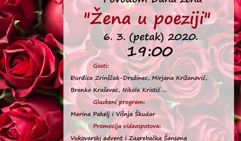 Općinska knjižnica Stubičke Toplice ovoga petka, 6. ožujka organizira glazbeno – poetsku večer „Žena u poeziji“. Gosti su Đurđica Zrinščak Družinec, Mirjana Križanović, Branko Kraševac i Nikola Kristić. Za glazbeni dio programa pobrinut će se Marina Pakelj i Višnja Škudar. Uz to, bit će upriličena i promocija videospotova Vukovarski advent i Zagrebačka šansona. Početak je u 19 sati.