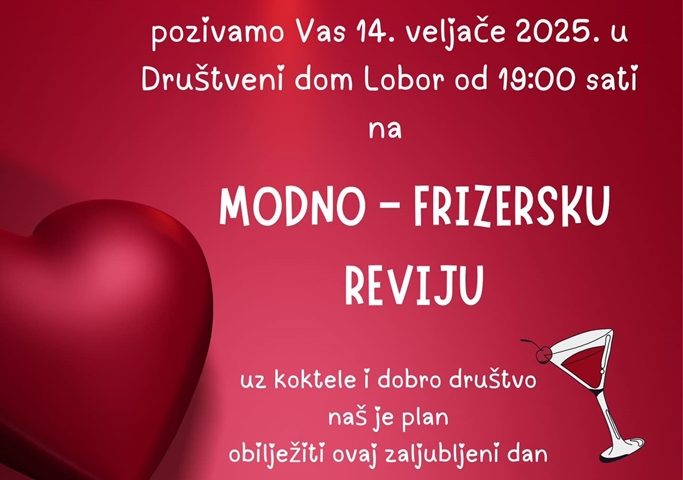 U Loboru se ove godine priprema jedinstveno događanje na Valentinovo pod nazivom „Loboru s ljubavlju“. Riječ je o modno-frizerskoj reviji koju organizira Općina Lobor zajedno s loborskim obrtnicama.  „Općina Lobor i loborske obrtnice s ponosom vas pozivaju na jedinstveni događaj – modno-frizersku reviju. Uživajte u kreativnosti, stilu i ljepoti koju donose naše talentirane frizerke, dizajnerice, kozmetičarke i cvjećarke. Dođite, podržite lokalne obrtnike i zajedno proslavimo ljubav u najljepšem izdanju“, stoji u pozivu saborske zastupnica i načelnice Općine Lobor Ljubice Jembrih. Samo događanje održat će se 14. veljače od 19 sati u Društvenom domu Lobor.