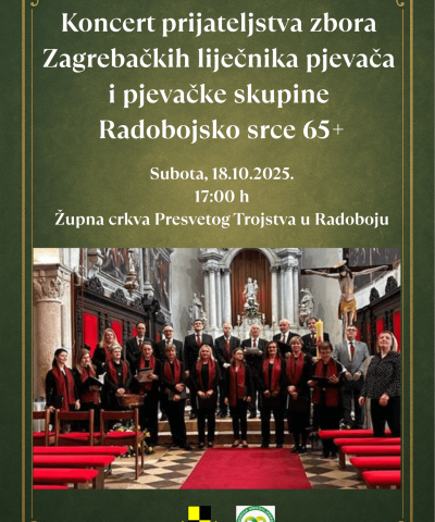 U subotu, 18. listopada 2025. godine, s početkom u 17 sati, u Župnoj crkvi Presvetog Trojstva u Radoboju održat će se Koncert prijateljstva. Na koncertu će nastupiti Zbor Zagrebačkih liječnika pjevača i pjevačka skupina Radobojsko srce 65+, koji će glazbom proslaviti prijateljstvo, zajedništvo i ljepotu pjesme.