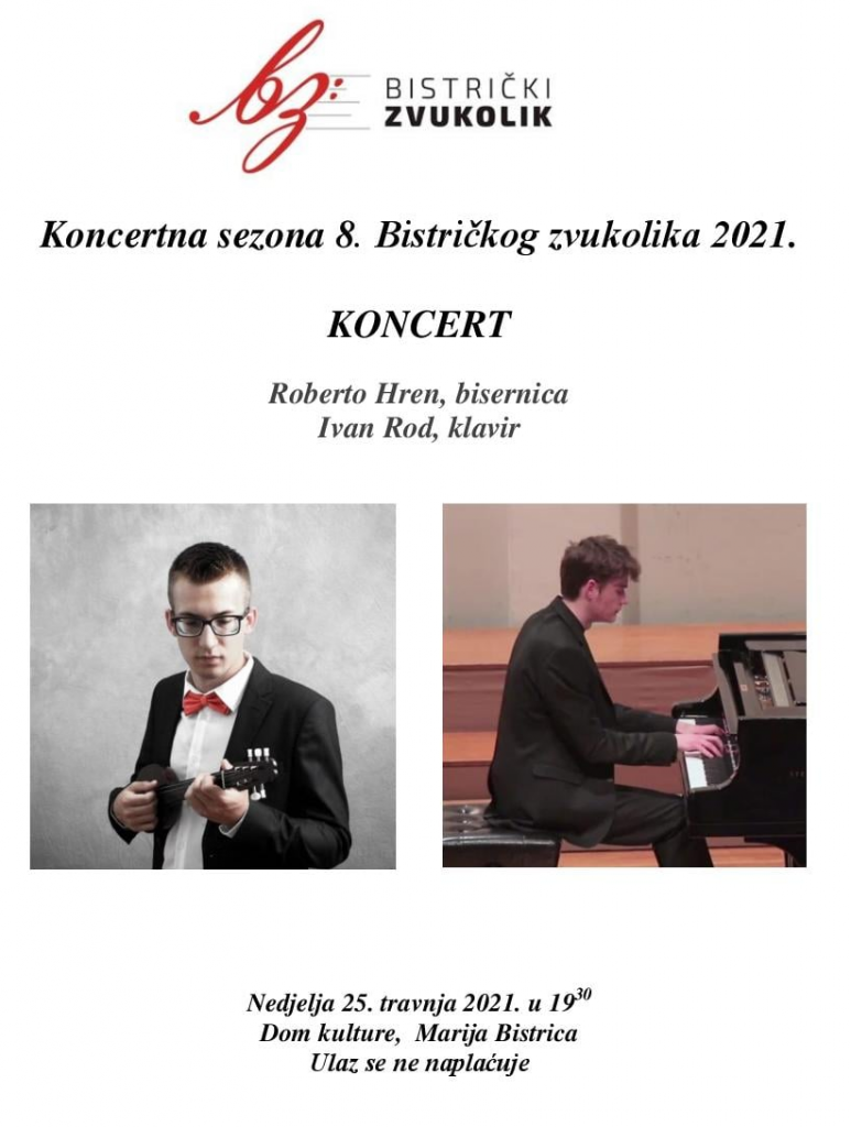 U Domu kulture u Mariji Bistrici ove nedjelje, 25. travnja će se održati koncert Roberta Hrena na bisernici i Ivana Roda na klaviru. Riječ je o koncertu iz ovogodišnje koncertne sezone 8. Bistričkog zvukolika, Međunarodnog glazbenog natjecanja u organizaciji Udruge ”Svesvir” Marija Bistrica. Koncert počinje u 19.30 sati, ulaz je slobodan uz pridržavanje svih epidemioloških mjera. No, s obzirom na ograničen broj posjetitelja, koncert će biti prenošen i online, na facebook stranici TZ Općine Marija Bistrica – Visit Marija Bistrica.