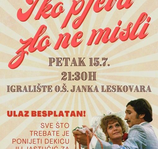 Savjet mladih Grada Pregrade organizira ljetno kino na igralištu OŠ Janka Leskovara u Pregradi. U petak, 15. Srpnja ,moći će se pogledati film „Tko pjeva, zlo ne misli“. Početak projekcije je u 21. 30, a ulaz je slobodan.