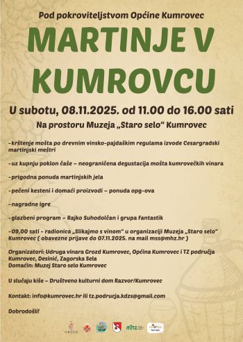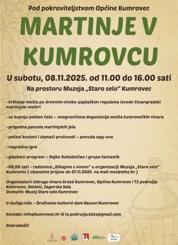 U subotu, 8. studenoga 2025. godine od 11 do 16 sati, u jedinstvenom ambijentu Muzeja „Staro selo“ Kumrovec održati će se tradicionalno Martinje v Kumrovcu, manifestacija koja svake godine okuplja ljubitelje vina, dobre hrane i veselja. Posjetitelje očekuje krštenje mošta po drevnim vinsko-pajdaškim regulama, koje će izvesti Cesargradski martinjski meštri, uz atmosferu humora i vinskih običaja. Uz kupnju poklon čaše, svi posjetitelji moći će uživati u neograničenoj degustaciji mošta kumrovečkih vinara, bogatoj ponudi martinjskih jela, pečenim kestenima, domaćim proizvodima OPG-ova, te sudjelovati u nagradnim igrama. – poručuju organizatori. Za odličnu zabavu pobrinut će se Rajko Suhodolčan i grupa Fantastik, a dan će započeti već u 9 sati posebnom radionicom „Slikajmo s vinom“ u organizaciji Muzeja „Staro selo“ Kumrovec (uz obavezne prijave do 7. studenoga na e-mail: mss@mhz.hr. Organizatori su Udruga vinara Grozd Kumrovec, Općina Kumrovec i Turistička zajednica područja Kumrovec, Desinić, Zagorska Sela, uz domaćina Muzej „Staro selo“ Kumrovec.