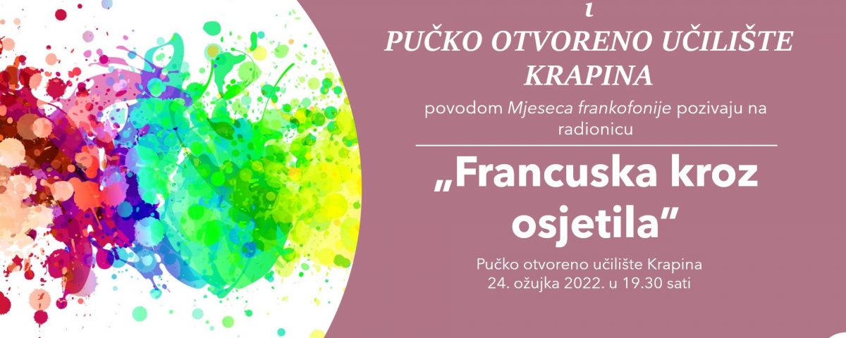 Pučko otvoreno učilište Krapina nizom aktivnosti sudjeluje u manifestaciji „Mjesec frankofonije 2022.“. U suradnji s Francuskim institutom i Hrvatskom mrežom neovisnih kinoprikazivača tijekom ožujka pripremili su program filmova na francuskom od kojih su već prikazali novi film trenutno vodeće francuske redateljice i scenaristice Celine Sciamme „Mala mama“, a u četvrtak 31. ožujka u 20 sati prikazivat će francusku romantičnu dramu „Ljubavne afere“. U četvrtak 24. ožujka u maloj dvorani Pučkog otvorenog učilišta, u suradnji sa Školom stranih jezika Versus organiziraju interaktivnu radionicu „Francuska kroz osjetila“. Radionica je namijenjena svim uzrastima, a vodi je Lucija Mlakar, profesorica hrvatskog i francuskog jezika. Poseban gost radionice je mladi kuhar Tibor Klobučar koji će prezentirati neka jela francuske kuhinje. Za sve programe ulaz je slobodan. Inače, ožujak je već tradicionalno mjesec frankofonije koja se službeno slavi 20. ožujka na Međunarodni dan frankofonije i obilježava se u različitim zemljama u kojima se govori francuski ili postoje francuski instituti. Francuski institut u Hrvatskoj osnovan 1921. godine te već više od 100 godina radi na promociji francuske kulture i jezika u Hrvatskoj kao i na promociji znanosti i visokog obrazovanja.