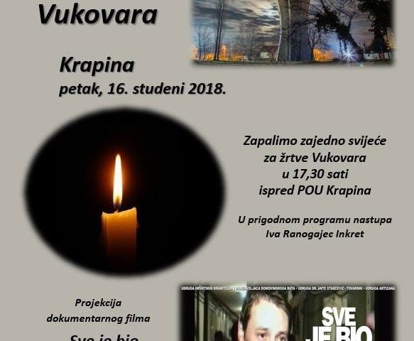 Dan sjećanja na žrtvu Vukovara obilježit će se ovoga petka, 16. studenog zajedničkim paljenjem svijeća za žrtve Vukovara ispred Pučkog otvorenog učilišta Krapina u 17.30 sati. U prigodnom programu nastupit će Iva Ranogajec Inkret. Nakon toga, u 18 sati, slijedi projekcija dokumentarnog filma „Sve je bio dobar san“, autora Branka Ištvančića. Ulaz je besplatan.