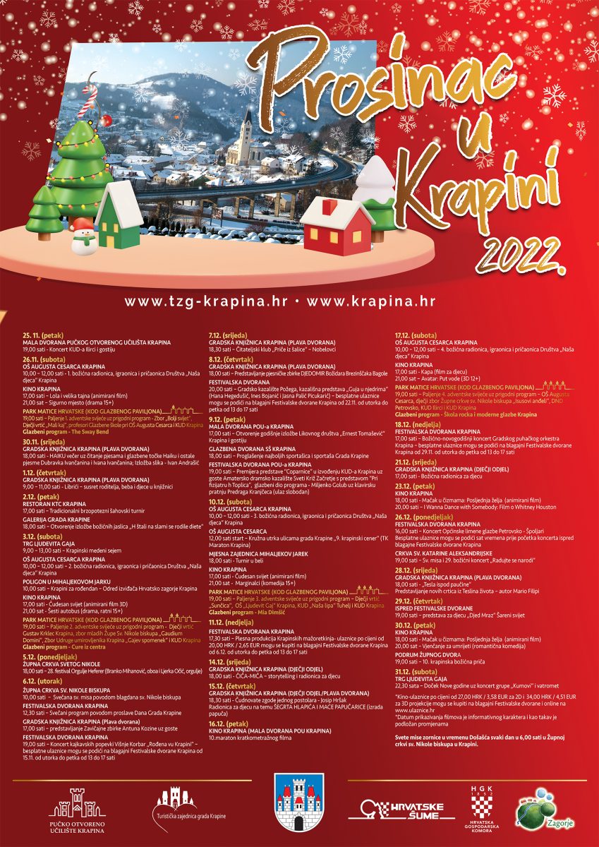 I ove godine Turistička zajednica Grada Krapine s Gradom Krapina, Pučkim otvorenim učilištem Krapina i brojnim krapinskim udrugama organizira manifestaciju „Prosinac u Krapini“ koju će obilježiti brojni prigodni koncerti, izložbe, priredbe za djecu i ostala događanja. Manifestacija započinje ovog petka koncertom KUD-a Ilirci i njihovih gostiju u Maloj dvorani Pučkog otvorenog učilišta Krapina s početkom u 19 sati. Paljenje adventskih svijeća održavat će se na novoj lokaciji – u Glazbenom paviljonu, u parku Matice hrvatske i to subotama (26. studenoga, 3., 10. i 17. prosinca) kada Krapinčane i njihove goste očekuje ponajprije glazbeni program u izvedbi učenika krapinskih osnovnih škola, mališana dječjih vrtića i članova udruga, a potom će uslijediti poseban koncert. Prve subote 26. studenoga nastupit će The Sway Bend, druge 3. prosinca Cure iz centra, potom 10. prosinca Mia Dimšić, a 17. prosinca polaznici Škole rocka i moderne glazbe. Cjelokupan program nalazi se na mrežnim stranicama Grada Krapine.
