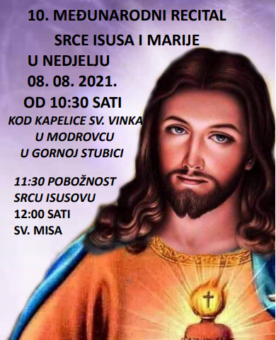 U nedjelju 08.kolovoza kod kapelice sv. Vinka u Modrovcu, u Gornjoj Stubici, održat će se proštenje i 10. međunarodni Recital “Srce Isusa i Marije”. Program Recitala počinje u 10,30 javnim čitanjem radova koji su odabrani za tiskanje u 10. gornjostubičkom Zborniku . Ove godine objavljeni su radovi vjerske tematike 61 autora, od njih 65 koliko ih se javilo na natječaj koji je bio otvoren do 1. lipnja 2021, a odabralo ih je izborno povjerenstvo u sastavu Mladen Ptičar, predsjednik Društva hrvatski katolički muževi župe Đurmanec, Sandra Majsec i vlč. Nikola Jurković. Ove godine zaprimljeni su radovi iz Hrvatske, BiH, Srbije, Njemačke, Kanade i Švicarske.