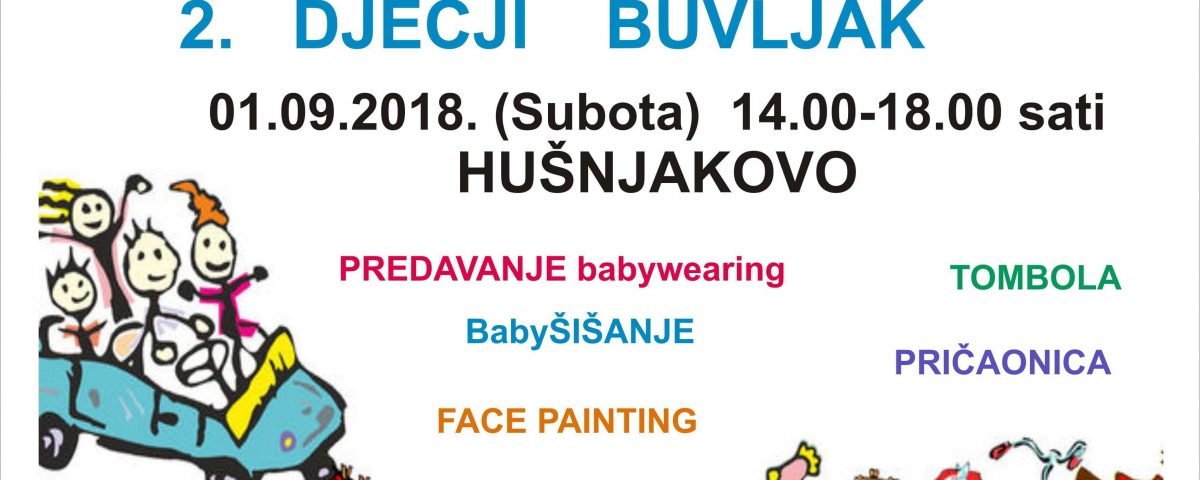 Udruga „Smiješak„ i Grupa za potporu dojenja „Librići“ organizira ove subote na Hušnjakovu u Krapini 2. „Dječji buvljak“. Organizatori pozivaju mame, tate, bake, trudnice i sve koji žele nešto prodati nešto, kupiti ili razmijeniti da ih posjete. Za ovo događanje koje će trajati od 14 do 18 pripremaju i dodatne sadržaje. Organiziraju i tombolu. U slučaju lošeg vremena sve će se održavati u prostorima OŠ Augusta Cesarca Krapina. Dodatne informacije su na broj tel: 098 917-1178.