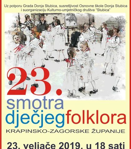Zajednica amaterskih kulturno-umjetničkih udruga KZŽ i KUD Stubica organiziraju 23. Smotru dječjeg folklora Krapinsko-zagorske županije koja će se održati u prostoru Osnovne škole Donja Stubica. Nastupit će šesnaest dječjih folklornih skupina iz jedanaest Kulturno-umjetničkih društava, a koje će se predstaviti izvedbama folklorne građe primijenjene djeci. Najzastupljenije su, naravno, dječje igre, pjesme i plesovi Hrvatskog zagorja, ali mali folkloraši prezentirat će posjetiteljima i tradicijsku baštinu Međimurja, Podravine, Slavonije i Dalmacije. U programu će sudjelovati više oko 500 folkloraša u dobi od četiri do četrnaest godina. Nastupe skupina, sa stručnog aspekta, pratit će naš najistaknutiji poznavatelj dječjeg folklora, selektor HDFKIV (Hrvatsko društvo folklornih koreografa i voditelja), Goran Knežević, koji će ujedno odabrati najuspješnije za predstavljanje Županije na Smotrama i festivalima više razine. Smotra počinje u 18 sati. Ulaz je slobodan.