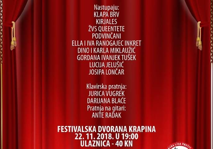 Zagorska liga protiv raka organizira još jedan u nizu humanitarnih koncerata. Na koncertu Pjesmom do zdravlja prikupljati će se sredstva za nabavu integrirane čekaonice za medicinsko-biokemijski laboratorij Specijalne bolnice za medicinsku rehabilitaciju Krapinske Toplice. Na koncertu Pjesmom do zdravlja nastupiti će: Klapa Brv, Kirjales, ŽVS Queentete, Podvinčani, Ella i Iva Ranogajec, Dino i Karla Miklaužić, Gordana Ivanjek Tušek, Lucija Jelušić i Josipa Lončar. U klavirskoj pratnji će biti Jurica Vugrek i Darijana Blaće, a na gitari će svirati Ante Radak. Koncert će se održati u Festivalskoj dvorani u Krapini sutra s početkom u 19,00 sati. Cijena ulaznice je 40,00 kuna.