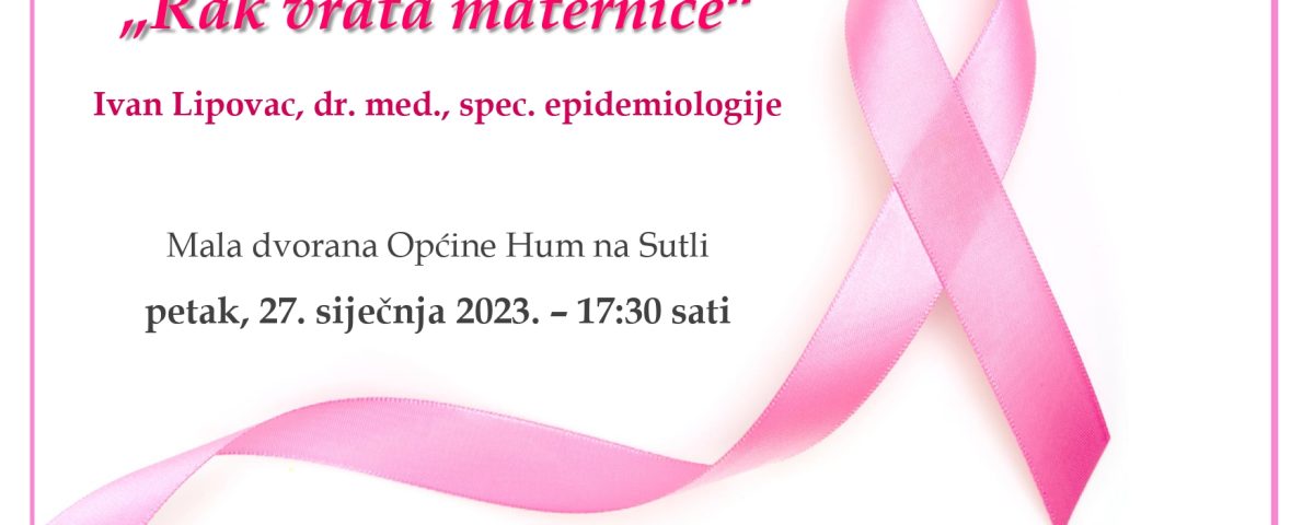 Povodom mjeseca svjesnosti i borbe protiv raka vrata maternice ovog će petka, 27. siječnja u maloj dvorani Općine Hum na Sutli predavanje na temu raka vrata maternice održati spec. epidemiologije, dr. Ivan Lipovac. Predavanje organizira Udruga „Mala sredina“, a kako ističu sudjelovanje je potpuno besplatno. Početak je u 17.30 sati.