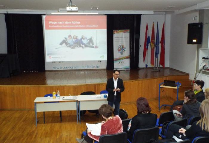 Ovih je dana u Srednjoj školi Krapina boravio specijalni profesionalni savjetnik za obrazovanje i zapošljavanje u inozemstvu, Dominic Erfkamp ispred Središnjeg njemačkog ureda za zapošljavanje. Učenici koji pohađaju fakultativnu nastavu „Njemački jezik za Njemačku jezičnu diplomu (DSD II)“, tako su se već petu godinu zaredom mogli izravno informirati o mogućnostima obrazovanja, studiranja, stipendiranja i zapošljavanja u SR Njemačkoj. Učenici su dobili osnovne informacije o načinima i postupcima natjecanja za studij u Njemačkoj, ali i drugim zemljama njemačkog govornog područja. Zbog izrazito velikog interesa učenika za ovakvom vrstom informiranja, dogovoreno je da se ova suradnja nastavi i dalje, sa mogućnošću da se individualno savjetovanje proširi i na nekoliko dana.