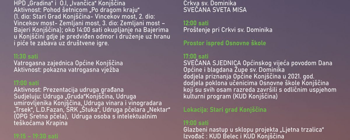 Ove subote u 8 sati biciklijadom „Putevina rudara“ započet će program obilježavanja Dana općine Konjščina, blagdana Svetog Dominika, koji se slavi 8. kolovoza. U nedjelju, na sam Dan općine i župe, u 10 i 30 na općinskom groblju je paljenje svijeća povodom Dana pobjede i domovinske zahvalnosti i Dana hrvatskih branitelja, Dana općine i župe. Svečana sveta misa u crkvi Svetog Dominika je u 11 sati, a održava se i tradicionalno proštenje. Svečana sjednica Općinskog vijeća povodom Dana Općine i Župe, uz dodjelu općinskih priznanja i dodjelu poklona učenicima koji su svih osam razreda Osnovne škole Konjščina završili s odličnim uspjehom, te prigodni program, održat će se s početkom u 17 sati na prostoru ispred škole. U nedjeljnom programu od 19 sati je koncert u sklopu projekta „Mala ljetna trzalica”, a nastupaju KUD-ovi Belec i Konjščina. Zanimljiv program od 19 i 45 bit će i u organizaciji Udruge grofovija Konjski. I ove godine jedno od tradicionalnih događanja je „Dečec kup“ u organizaciji NK Sloga koji je na rasporedu u nedjelju od 10 sati. Sva događanja održat će se prema važećim epidemiološkim mjerama, najavila je načelnica Konjščine, Anita Krok. Ujedno je na pridržavanje svih epidemioloških mjera pozvala sve sudionike i posjetitelje proslave Dana Općine Konjščina i Župe sv. Dominika.