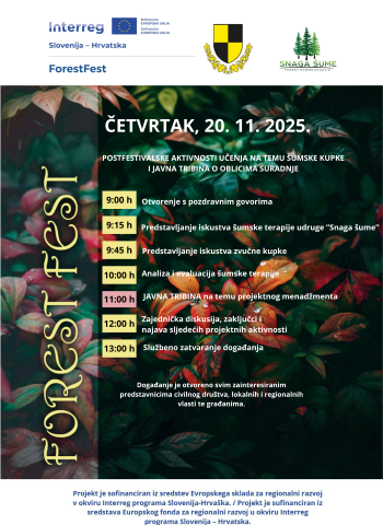 U četvrtak, 20. studenoga 2025., u Općini Radoboj održat će se postfestivalsko bilateralno događanje projekta ForestFest, koje će kroz aktivnosti „od građana za građane“ okupiti stručnjake, organizatore, udruge i sve zainteresirane građane. S početkom u 9 sati program će započeti od strane udruge „Snaga šume“, koja će predstaviti iskustva vođenih šumskih kupki u Radoboju i slovenskih Beltincima. Upravo su te dvije općine tijekom ove godine nosile programsku okosnicu projekta ForestFest: Radoboj je u svibnju organizirao bogat festivalski program, dok su u Beltincima održani predfestivalski i festivalski sadržaji koji su dodatno obogatili prekograničnu suradnju. ForestFest se i ove godine dokazao kao manifestacija koja spaja prirodu, kulturu, osobni rast i lokalnu zajednicu. Programi poput šumske kupke, radionica šumske pedagogije, meditacija, likovnih kolonija, predavanja, izložbi i glazbenih događanja privukli su sudionike svih dobnih skupina. Spoj edukativnog, rekreativnog i umjetničkog sadržaja postao je zaštitni znak festivala.