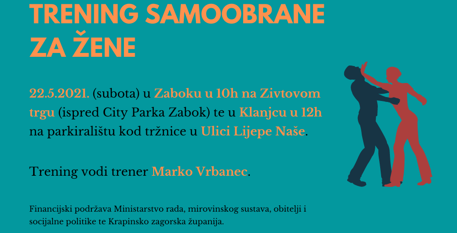 SOS telefon i savjetovalište za žene žrtve nasilja KZŽ organizira dva treninga/pokazne radionice samoobrane za žene. Prvi trening će se održati u subotu, 22. svibnja u 10 sati u Zaboku, a drugi u 12 sati u Klanjcu. Aktivnost financira Ministarstvo rada, mirovinskog sustava, obitelji i socijalne politike kao i Krapinsko- zagorska županija. Trening će voditi trener Marko Vrbanec.
