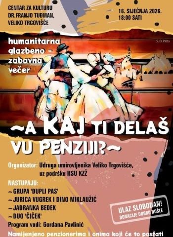 Udruga umirovljenika Veliko Trgovišće uz podršku Hrvatske stranke umirovljenika Krapinsko-zagorske županije organizira humanitarnu glazbeno-zabavnu večer pod nazivom: „A kaj ti delaš vu penziji?“ Ovaj nesvakidašnji program održat će se u Centru za kulturu Dr. Franjo Tuđman u Velikom Trgovišću ovaj petak, 16. siječnja 2026. s početkom u 18 sati. U programu sudjeluju brojni poznati gosti, a za glazbeni dio pobrinut će se: grupa „Dupli pas“, Jurica Vugrek i Dino Miklaužić, Jadranka Bedek i Duo „Čiček“. Ulaz na spomenuto događanje je slobodno, a donacije su dobro došle poručuju organizatori i  pozivaju da im se pridruže ne samo penzioneri, već i oni koji će to jednoga dana postati.