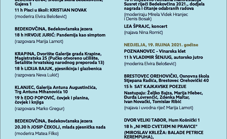 Ovog vikenda održava se bedekovčanska 52. književno – recitalna manifestacija Susret riječi. Slogan manifestacije čiji je pokrovitelj KZŽ jest “nove ideje za drugih pola stoljeća”. Trajat će 3 dana, a osim u Bedekovčini odvijat će se Zaboku, Krapini, Klanjcu te u Dvoru Veliki Tabor. Za sve događaje obavezna je rezervacija ulaznica na e-mail ulaznice@bedekovcina.hr ili na broj telefona 049/213-963. Sva događanja odvijat će se sukladno propisanim epidemiološkim mjerama i preporukama nadležnih tijela. Manifestacija počinje danas u 11 sati programom Pisci u školi u Srednjoj školi Krapina gdje će se predstaviti Hrvoje Jurić, te u Srednjoj školi Bedekovčina gdje će gostovati Kristijan Novak. Današnji program nastavlja se u 18 sati u Bedekovčini gdje će o pandemiji i njezinu utjecaju na čovjeka, ali i na kulturu te mnoga druga područja života s filozofom, bioetičarem i pjesnikom Hrvojem Jurićem razgovarati profesorica i pjesnikinja Marija Lamot. U Krapini će danas u 18 sati nastupiti pjesnikinja i kantautorica Lidija Bajuk, a u Klanjcu u 19 sati pisac Edo Popović. Na Bedekovčanskim jezerima predstavit će se mlada pjesnička nada Josip Čekolj. Bogat program posjetitelje očekuje i ove subote i nedjelje.