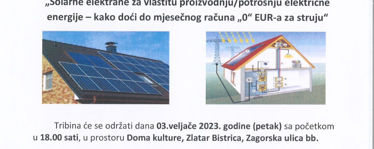 U Domu kulture u Zlatar Bistrici ovog će se petka održati javna tribina- predavanje na temu „Solarne elektrane za vlastitu proizvodnju/potrošnju električne energije – kako doći do mjesečnog računa ”0” EUR-a za struju“. Predavanje je namijenjeno svim zainteresiranim građanima koji žele saznati više o sunčanim elektranama te je otvorena za javnost. Gost predavač bit će prof.dr.sc. Ljubomir Majdandžić, dipl.inž. sa Fakulteta elektronike, računarstva i informacijskih tehnologija Osijek. Javnu tribinu organizira Županijska organizacija HSS-a u suradnji sa Stručnim vijećem HSS-a te u suorganizaciji s Općinom Zlatar Bistrica. Početak je u 18 sati.
