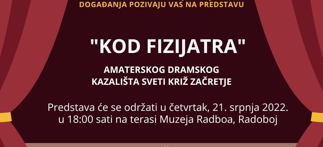 Program Radobojskih ljetnih događanja 2022. nastavlja se i dalje. Danas s početkom u 18 sati Amatersko dramsko kazalište Sveti Križ Začretje nastupit će na terasi Muzeja Radboa s humorističnom predstavom “Kod fizijatra”. Ulaz je slobodan. – poručuju organizatori.
