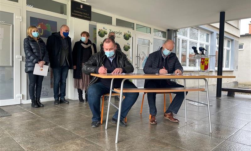 Ovaj četvrtak je u Krapinskim Toplicama održano potpisivanje ugovora za izvođenje radova na cjelovitoj obnovi zgrade osnovne škole Krapinske Toplice koja je oštećena u potresu u prosincu prošle godine. Ugovor je vrijedan 2,45 milijuna kuna s PDV-om, a potpisali su ga župan KZŽ Željko Kolar i Dubravko Belošević, direktor tvrtke BELOŠEVIĆ j.d.o.o., koja će biti izvođač radova. Župan Kolar je rekao da vjeruje kako će maksimalno u roku dva mjeseca biti obavljeni svi unutarnji radovi koji bi omogućili da djeca ponovno krenu u školu po modelu A. Nakon toga će se nastaviti s vanjskim radovima koji neće utjecati na mogućnost održavanja nastave. Ravnatelj osnovne škole Samson Štibohar rekao je kako je ovo veliki trenutak, iako bi najradije da do potresa nije došlo. „Današnjim potpisom ugovora osnivač, Krapinsko-zagorska županija, još je jednom pokazala da vodi računa ne samo o ovoj školi, nego i o svim ostalim školama na području županije“, rekao je Štibohar. Pročelnica upravnog odjela KZŽ za javnu nabavu i EU fondove Vlatka Mlakar rekla je da radovi obuhvaćaju zamjenu oštećenih dijelova unutrašnjosti građevine, zamjenu opasnih ostakljenja, zamjenu opasne rasvjete te sanaciju vanjskih fasadnih zidova skidanjem dotrajale oštećene žbuke te sanaciju zidova s vanjske strane zgrade i ugradnju fasadnog sustava, u skladu s današnjim standardima. Potpisivanju ugovora nazočili su i zamjenica župana Jasna Petek te načelnik Općine Krapinske Toplice Ernest Svažić.
