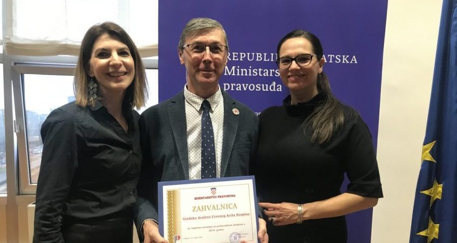 Pomoćnica ministra za zatvorski sustav i probaciju Jana Špero i načelnik Sektora za probaciju Goran Brkić ovaj su utorak u prostorijama Ministarstva pravosuđa dodijelili zahvalnice koje to Ministarstvo na prijedlog probacijskih ureda, uručuje pravnim i fizičkim osobama koje su u prethodnoj godini ostvarili najbolju suradnju u izvršavanju probacijskih poslova. Među dobitnicima zahvalnica je i Gradsko društvo Crvenog križa Krapina. Probacijski ured Zagreb II predložio je Gradsko društvo Crvenog križa Krapina kao primjer odlične suradnje u 2019. godini u izvršavanju probacijskih poslova, rada za opće dobro osuđenih osoba i njihove resocijalizacije. Zahvalnice je dobilo 25 pravnih i fizičkih osoba iz redova udruga civilnog društva koje brinu o osobama s posebnim potrebama, humanitarnim organizacijama, obrazovnim ustanovama, tijelima lokalne samouprave, zdravstvenim ustanovama i komunalnim poduzećima, a Ministarstvo pravosuđa zahvalnice za suradnju s probacijskom službom dodjeljuje od 2013. godine. Ravnatelju Gradskog društva Crvenog križa Krapina, Davoru Šimunoviću, zahvalnicu je uručila je pomoćnica ministra za zatvorski sustav i probaciju Jana Špero.